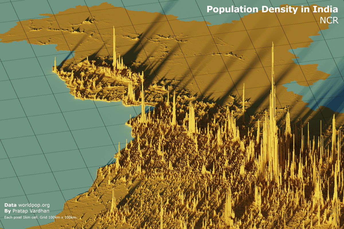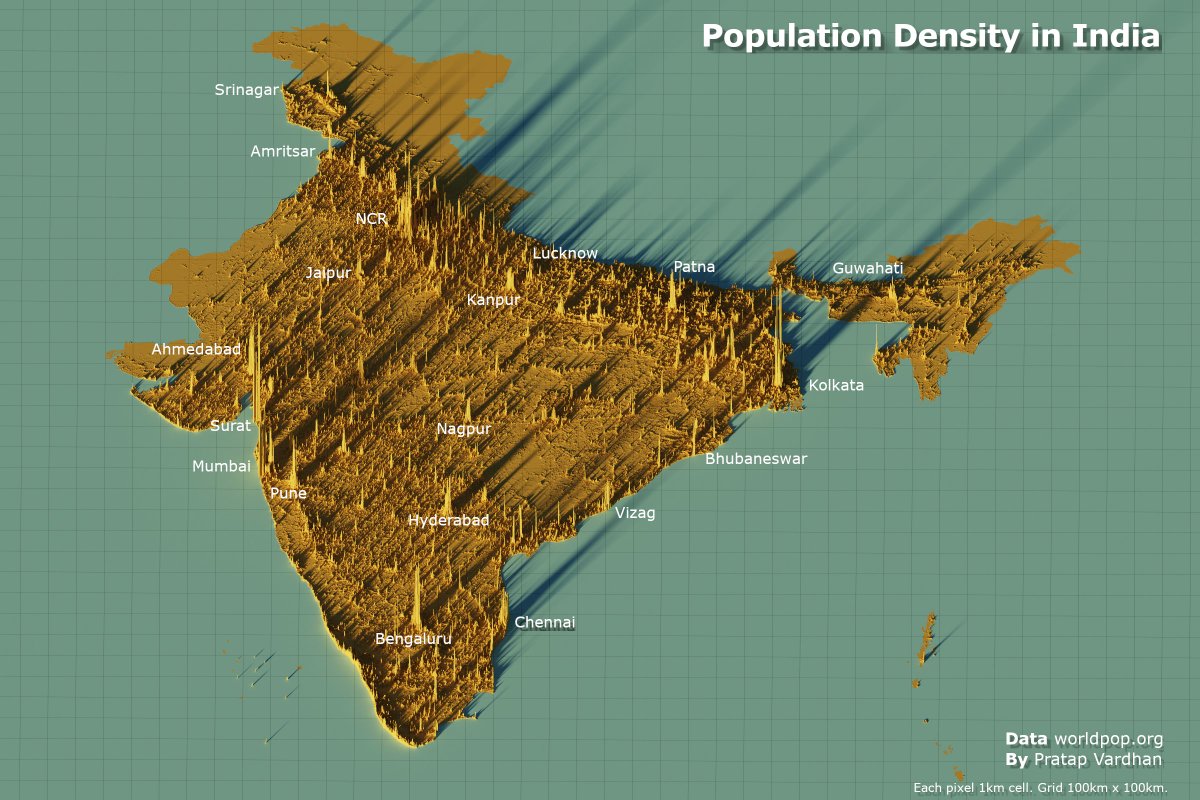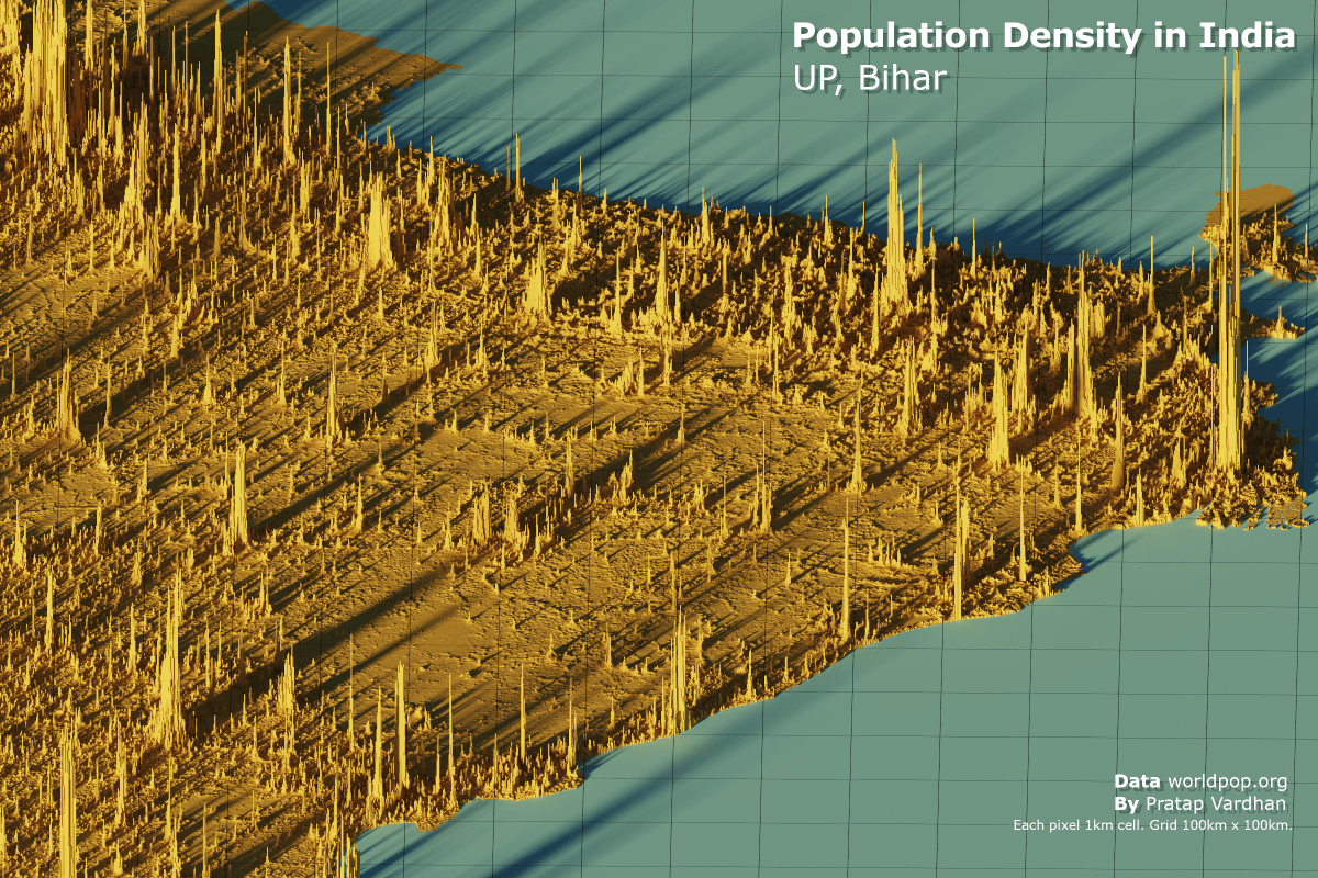 The map reveals the “usual suspects” when it comes to high-density areas. Uttar Pradesh and Bihar dominate as the most densely populated regions, while Delhi and its surrounding areas—extending into Haryana and Uttar Pradesh also stand out.